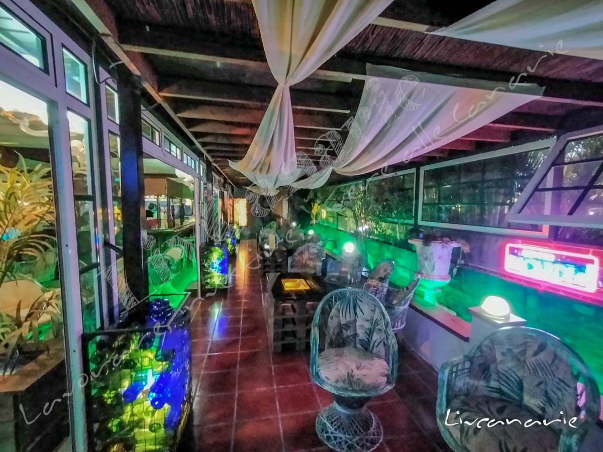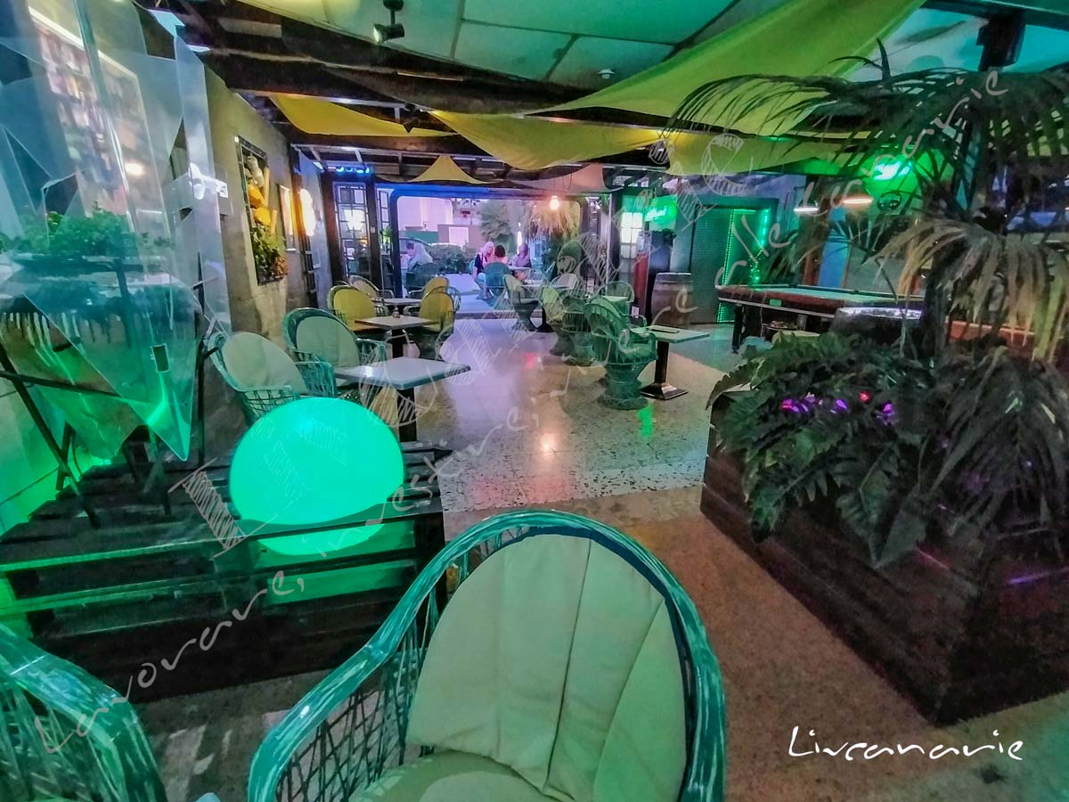 Il locale molto ampio è composto da una zona cucina, banconi per servire i clienti, molti posti a sedere e una piccola pista da ballo con una postazione da DJ.